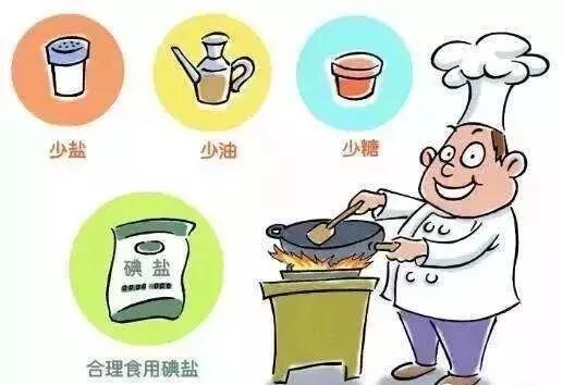减盐——食盐(钠)过多与高血压、胃癌、肾脏疾病等的发生有关。成年人每天食盐不超过6克。提倡使用定量盐勺,选择钠含量少的食品。